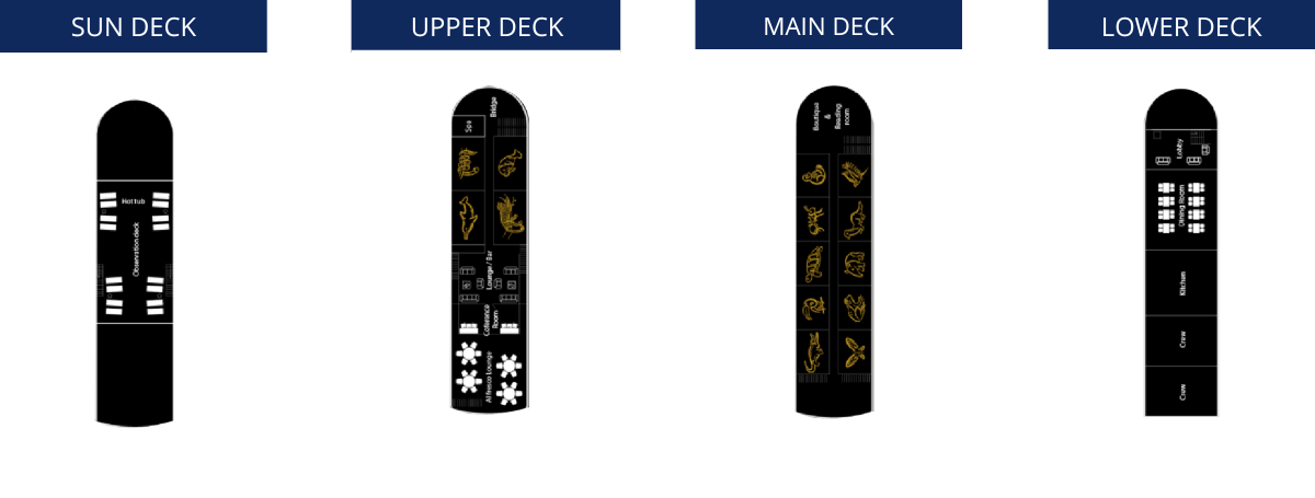 | Cabins | 14 cabins: 4 deluxe and 10 standard with french balconies. |