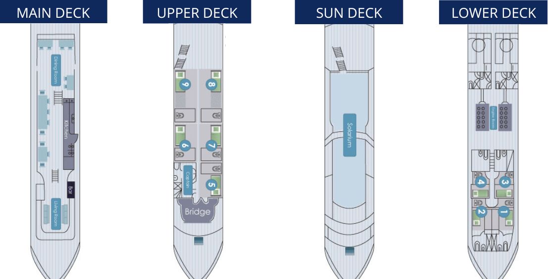 | Cabins | Lower deck: 1 Single Cabin, 4 Twins or Double Cabins |