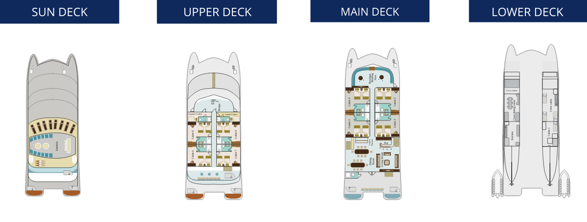| Cabins | 8 double cabins, 4 located on the upper deck and 4 on the main deck. All cabins include twin beds or a King size bed. |