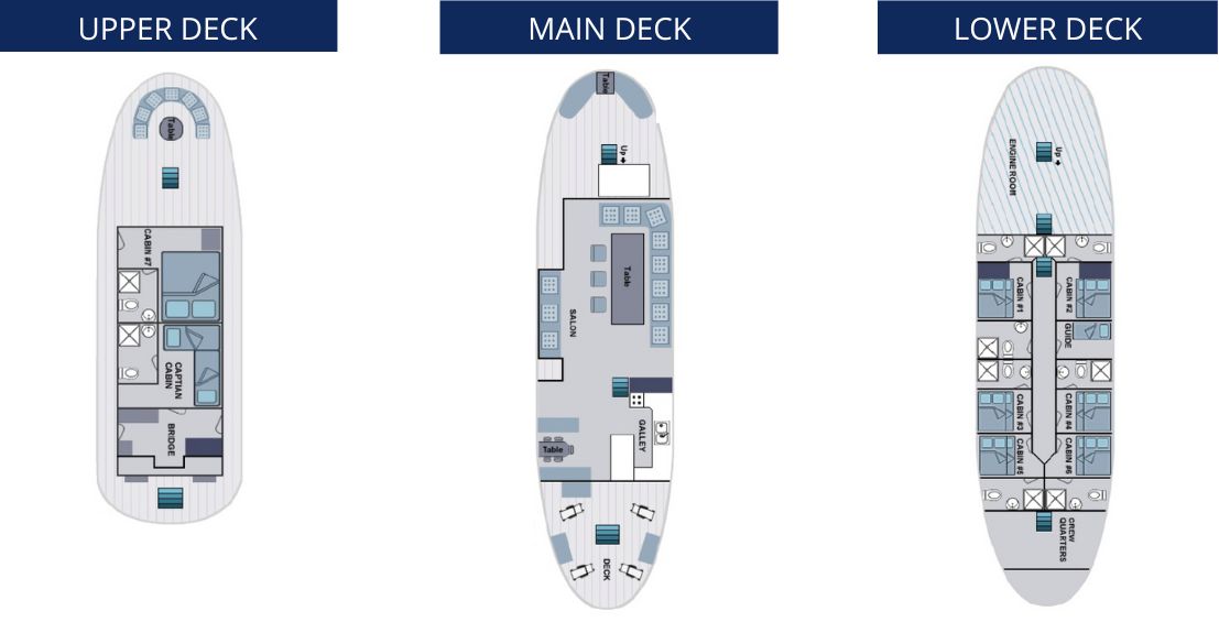 The upper deck with an outside dining area and sun protection are ideal for bird and marine life watching. On the main deck, is an outside area there is a dining salon with a library with TV/VCR and Stereo, here is where briefings and conference talks are given, and planning about the next day’s activities. Foredeck has enough space for sunbathing, dolphin watching, or just relaxing and observing marine life and the beautiful landscape of the islands. The ample and comfortable space on deck makes this boat ideal for nature and photography cruises, enjoying the Galapagos tourist superior class experience.