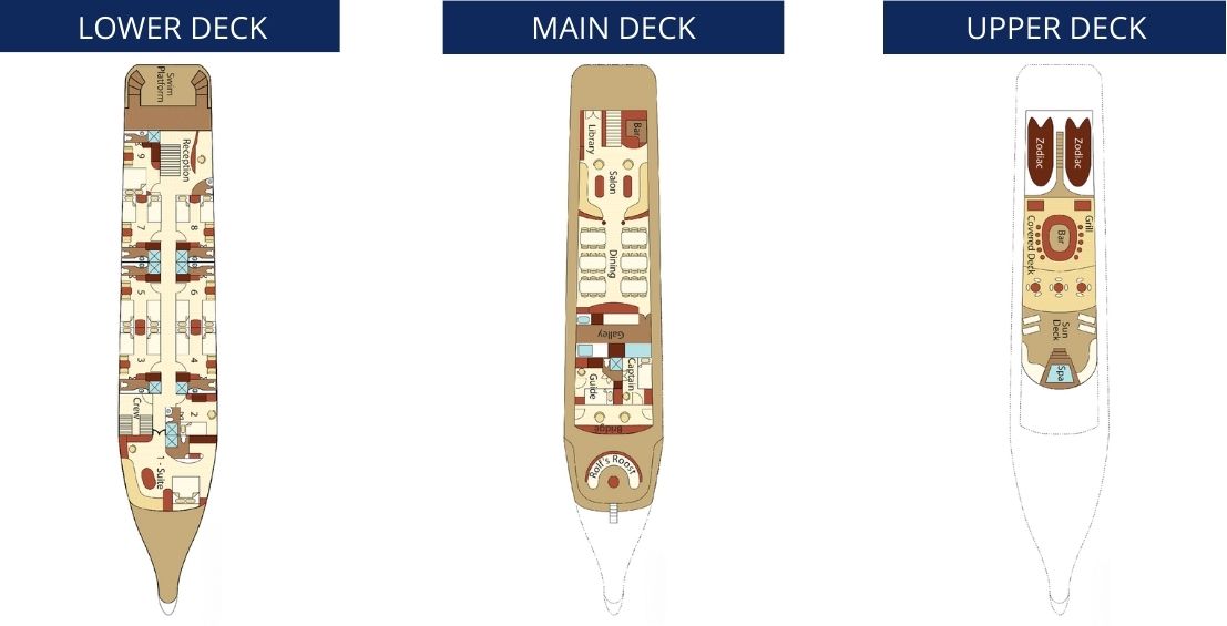 On the partially covered top deck, you’ll find a haven of relaxation with a spa, a well-stocked bar, and the tantalizing aroma of a barbecue sizzling in the sea breeze. Rest assured, your spacious, smartly decorated cabin and the sun-soaked deck offer perfect spots to relax and watch the majestic frigates in their natural habitat.