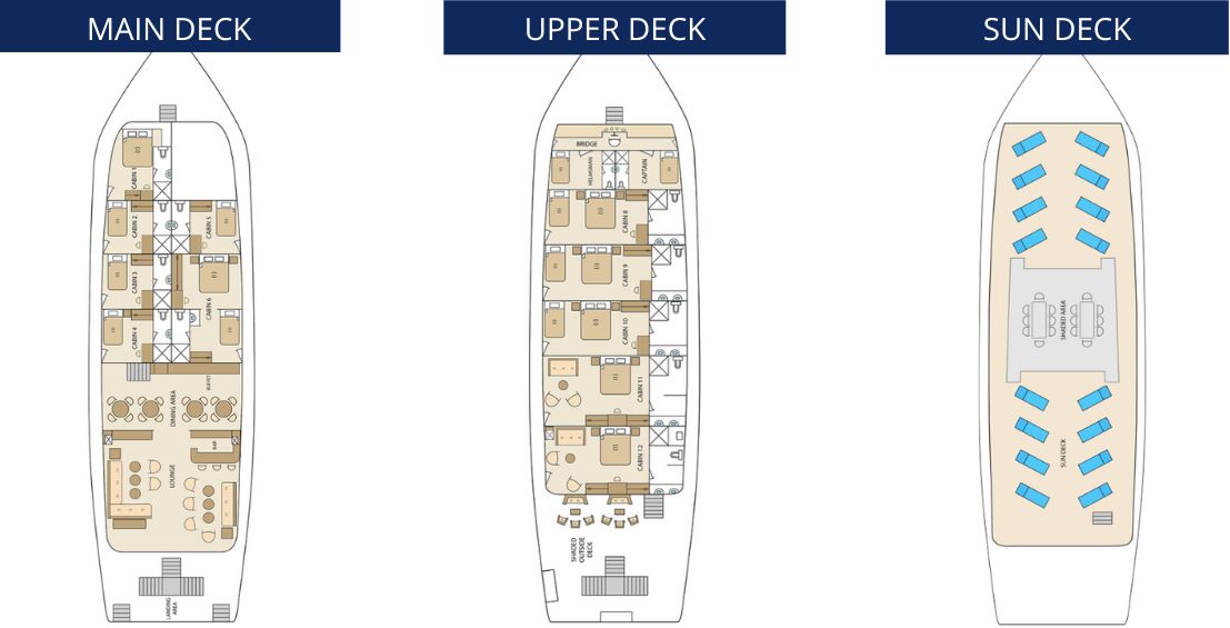 The Solaris Galapagos Cruise offers alternatives for everyone. Its amazing cabins have enough space, up to 26 square meters, also featuring triples in all 5 upper deck cabins. It’s 100% solo traveler-friendly; you can join one of our 5 main deck cabins with no supplement. Enjoy the views from the spacious sundeck or a drink at the outside bar. Solaris has ample spaces to rest & relax everywhere!